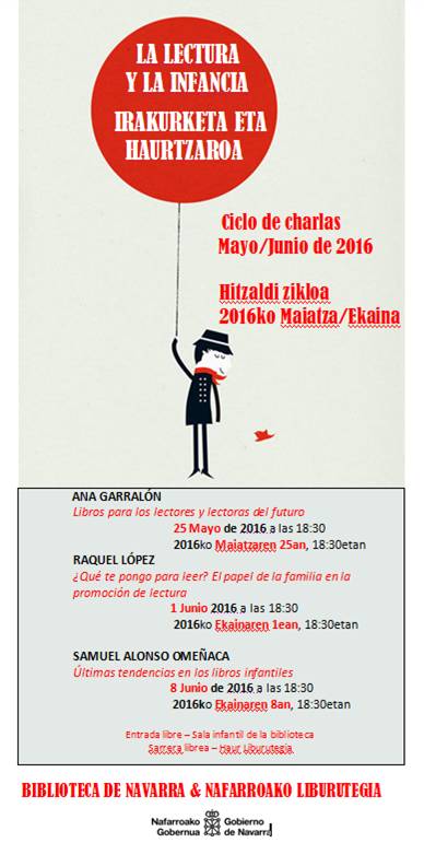 31.05.2016 08:17Buenos días, nos complace informar de que a partir de la próxima semana se inicia un ciclo de charlas abiertas al público titulado “La lectura y la infancia”. Durante tres miércoles consecutivos (el 25 de mayo, el 1 de junio y el 8 de junio) en la Sala infantil de la biblioteca de Navarra y a las 18:30 de la tarde, tres expertos –Ana Garralón, Raquel López Royo y Samuel Alonso- hablarán sobre distintos aspectos englobados todos bajo el título común de “La lectura y la infancia”. Esperamos que esta propuesta sea de vuestro interés.